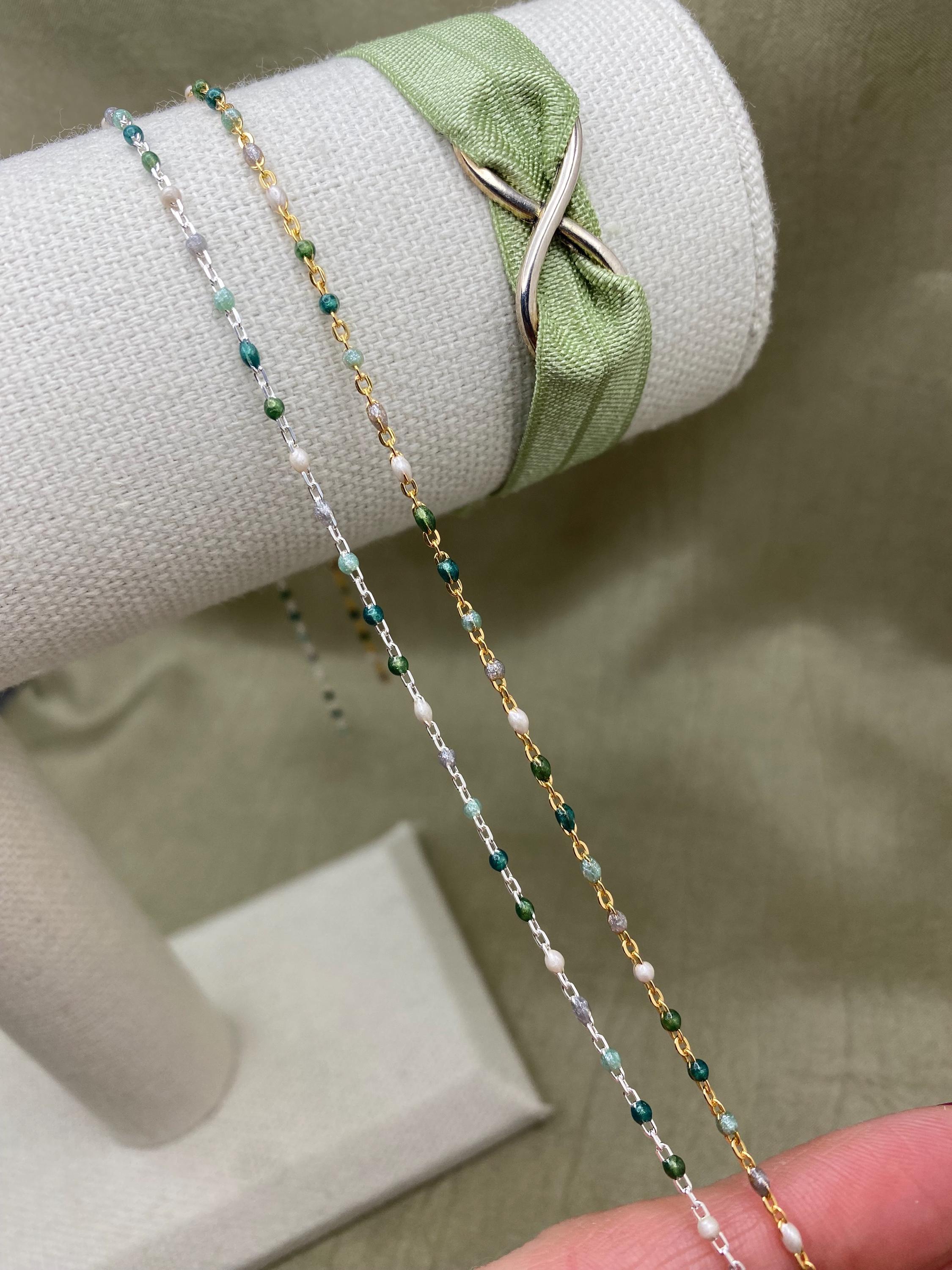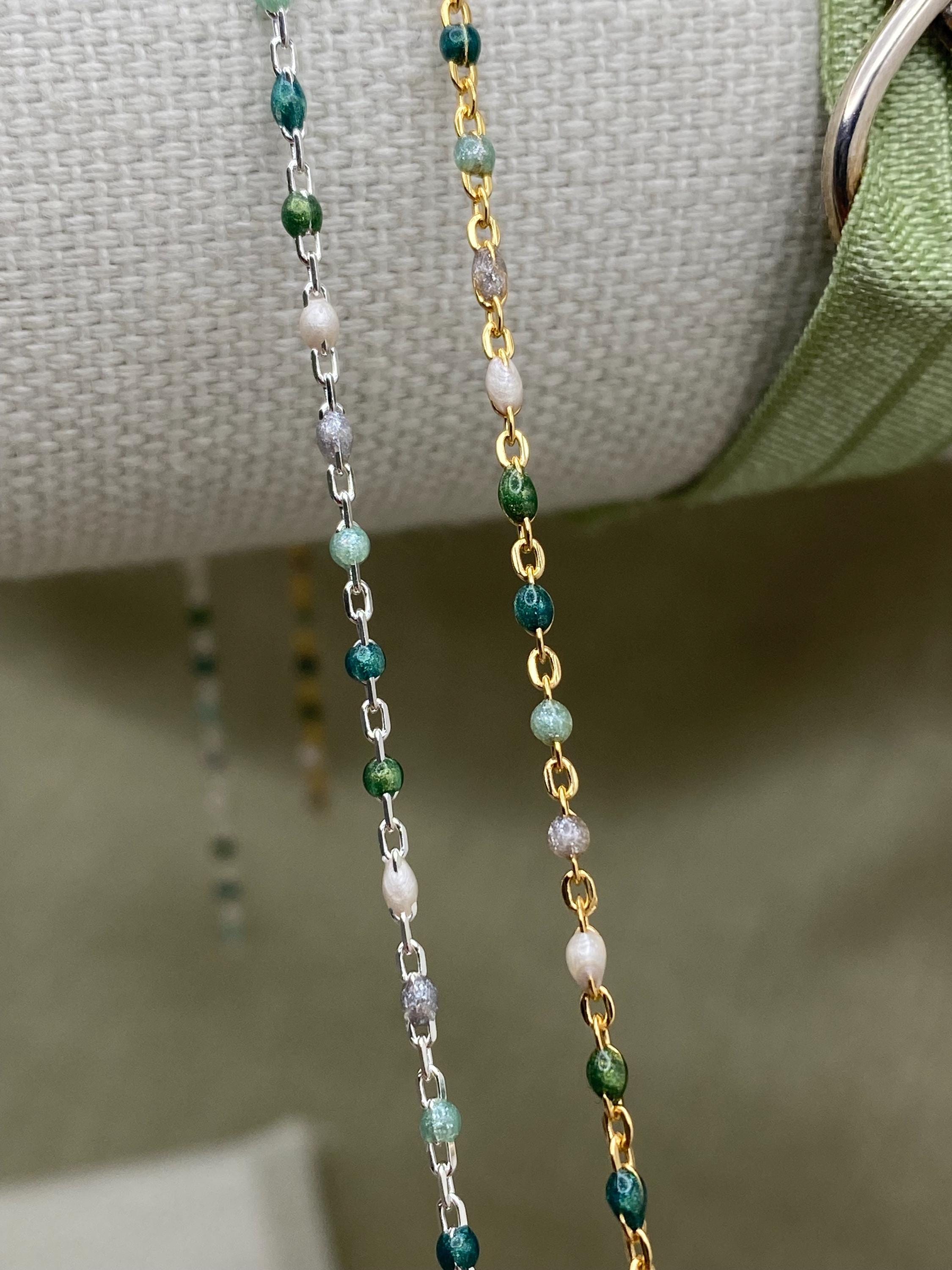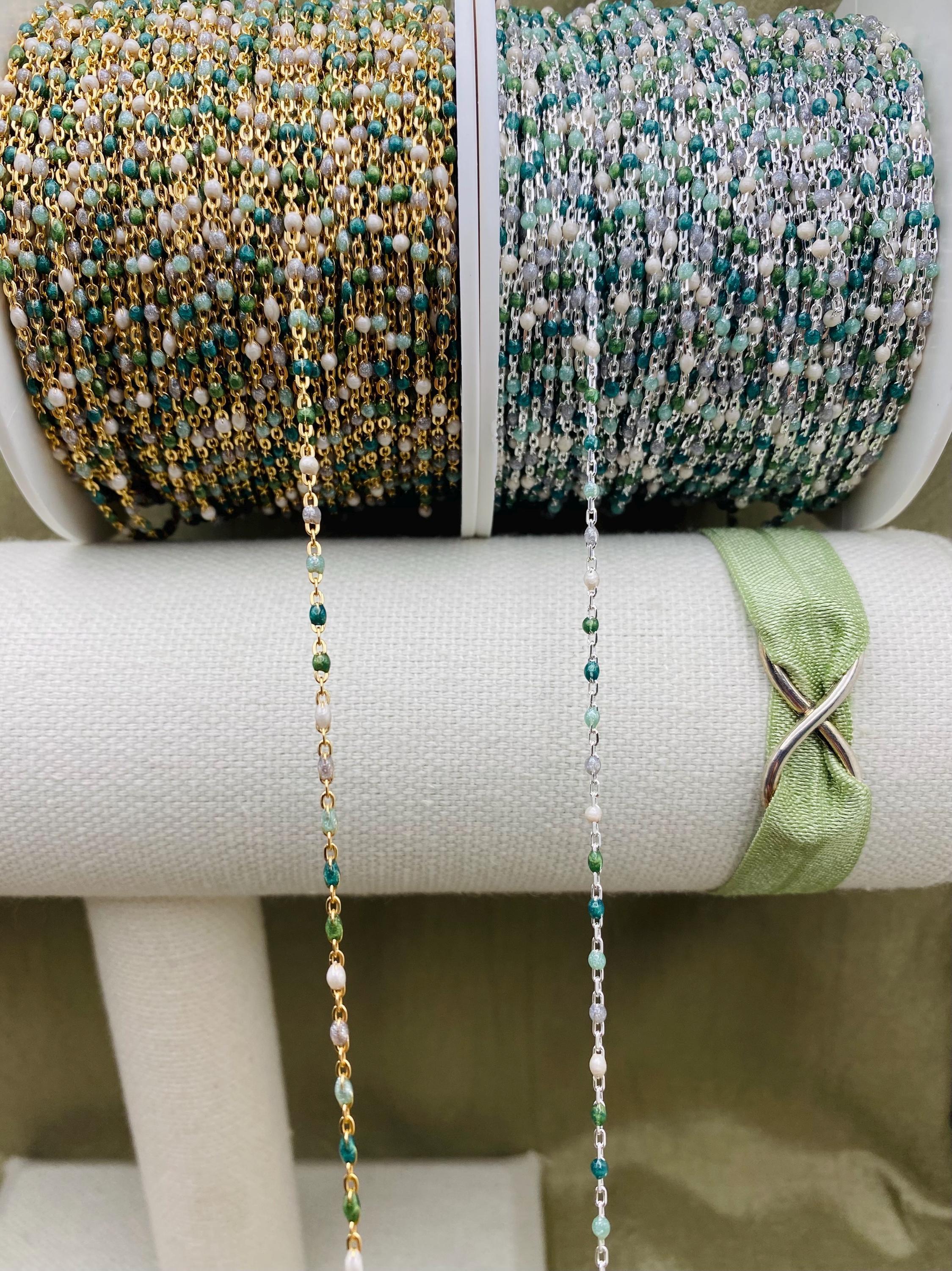 Our Glacier chain features 5 Pearlescent Colors: White, Grey, Blue, Blue Green and Sage